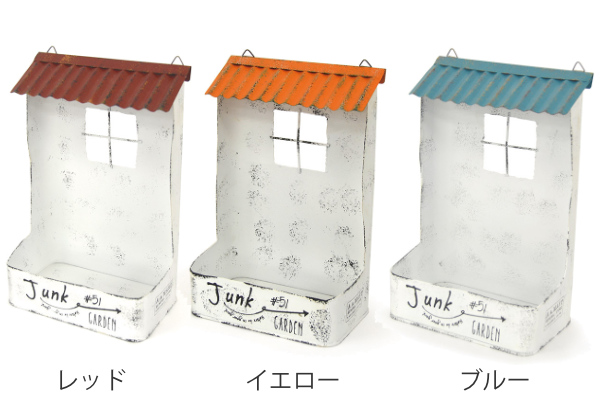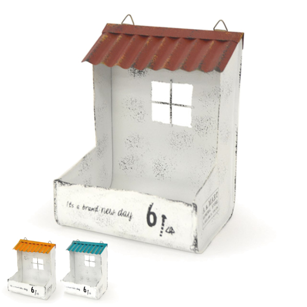 長く愛用されて塗装が剥がれた様子を丁寧なペイントで再現した壁掛けプランターです。白いベースにカラフルなトタン屋根がかわいく、植物のグリーンがよく合います。