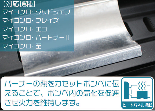バーナーの熱をカセットボンベに伝えることで、ボンベ内の気化を促進させ火力を維持するヒートパネルを搭載しています。ガスを最後まで無駄なく使うことが出来て経済的です。