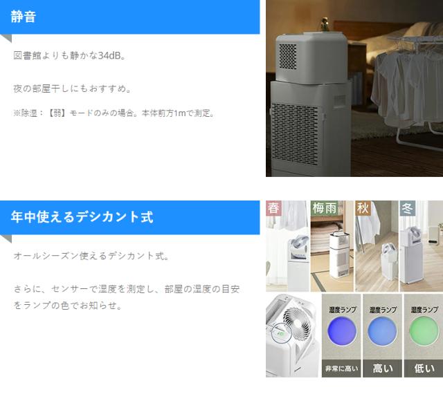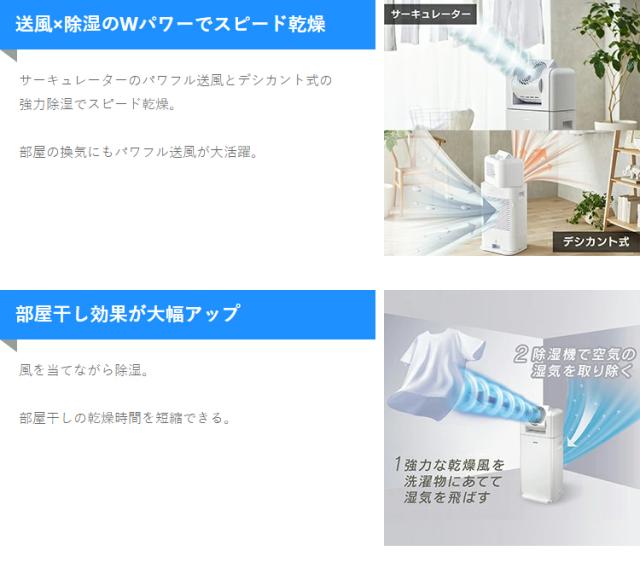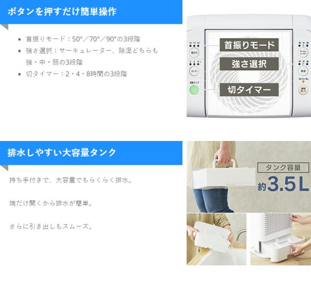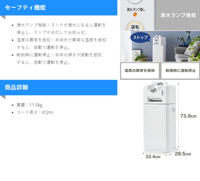 ■商品サイズ(cm)幅約33.4×奥行約28.5×高さ約73.9■本体重量約11.5kg■定格除湿能力※18.0L/日■除湿可能面積の目安※2木造:17m2(10畳)プレハブ:25m2(15畳)鉄筋コンクリート:33m2(20畳)■タンク容量約3.5L■使用温度0〜40℃■コード長さ約2m■除湿機能デシカント式■首ふりモード90°・70°・50°■強さ選択(サーキュレーター・除湿)各:強・中・弱■切タイマー2・4・8時間※1 定格除湿能力は、室温20℃、相対湿度60%を維持し続けたときの、1日(24時間)当たりの除湿量です。※2 除湿可能面積の目安は、JEMA(日本電気工業会)規格に基づいた数値です。