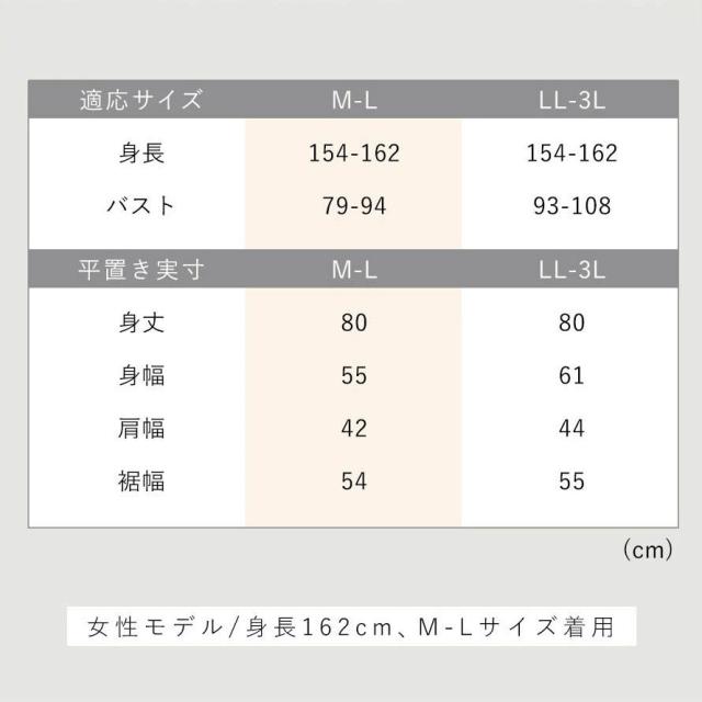 ■サイズ:身長/154-162、M-L/バスト79-94、身丈80、身幅55、肩幅42、袖丈54、LL-3L/バスト93-108、身丈80、身幅61、肩幅44、袖丈55cm、モデル/身長162cm、着用サイズM-L