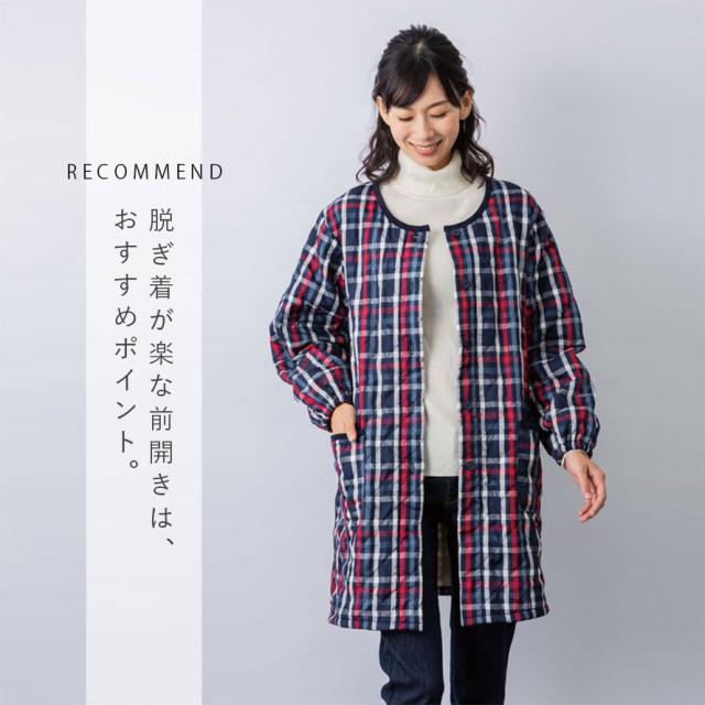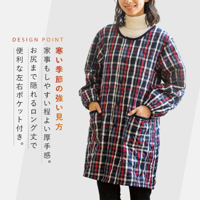 かっぽう着 丸襟 ロング丈 チェック柄 冬 秋冬 前開き 長袖 割烹着 あったか 暖かい かっぽうぎ 防寒 エプロン レディース 保育士 保育園 大きいサイズ スモッグ フリース キルト キルティング おしゃれ ギフト プレゼント M L LL 3L ポケット付き かわいい
