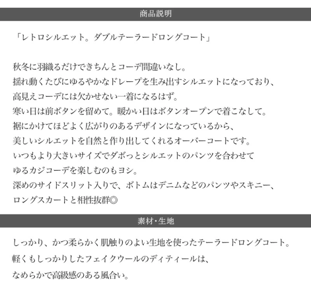 ![]() ![]() ![]() ![]() ![]() ![]() ![]() ![]() ![]() ![]() ![]() ![]() ![]() ![]() ![]() ![]() ![]() ★サイドスリット ロング丈無地ダブルテーラードガウンコート★ なめらかで高級感のある風合い。 高見えコーデには欠かせない一着になるはず! 裾にかけてほどよく広がりのあるデザインになっているから、 美しいシルエットを自然と作り出してくれます。 首元もゆったりと広がりがあるから窮屈感を感じにくいです◎ マフラーやストールもストレス感なくコーデできちゃいます。 通勤時の羽織などにも大活躍。 レビュー商品の評価: お店の情報お店の評価: 連絡・応対 - 配送スピード - 梱包 - |