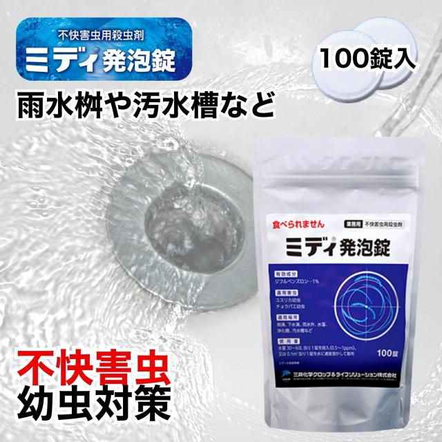 ミディ発泡錠 1% 3g 100錠入 脱皮阻害型 殺虫剤 害虫駆除 ユスリカ チョウバエ デミリン 脱皮阻害剤 ミディ発泡錠 幼虫駆除 不快害虫駆除 側溝 下水口 雨水桝 浄化槽 水溜り ジフルベンズロン 無臭 コバエ 幼虫駆除薬剤 三井化学アグロ 雨水 水質汚染防止 散布剤