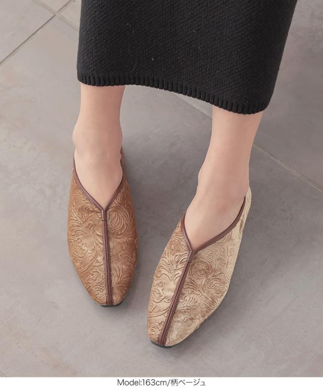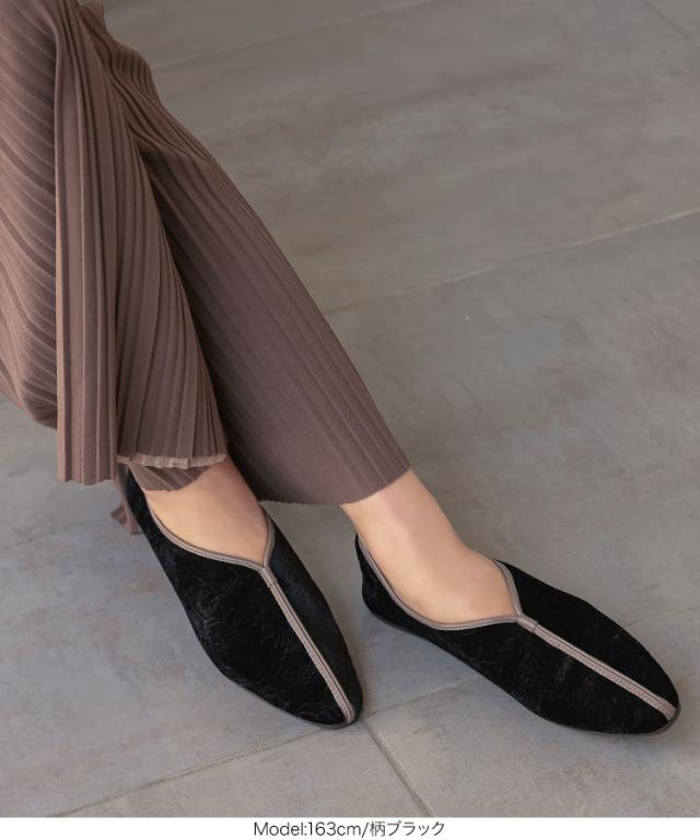 トレンディなパイピングとの配色がアクセントになるスクエアトゥのバブーシュ。甲が深めのカッティングで柔らかい素材なので脱ぎ履きもラクチン。【素材・サイズ感】S~LLの4サイズ展開。コーデにマッチするスエード調と合わせやすいけど柄がかわいいベロアタイプ※キャンセル/変更不可※お届けまでの日程について