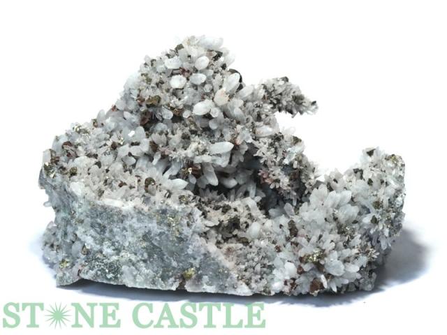 パイライトと細く透明感がある水晶の共生クラスターです。パイライトの断面の金色が美しく輝きます。