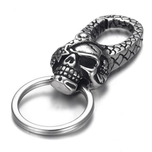 サージカルステンレス316L製のキーリングに星の眼帯をしたドクロのカニ冠をつなげた鍵やチェーンの財布をつなぐのにぴったりのキーホルダー。
