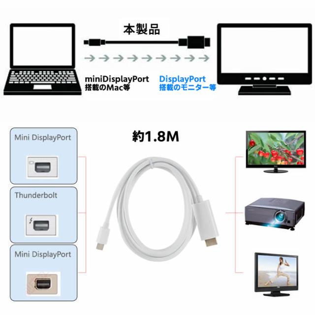 mini DisPlayPortケーブル Mini Displayport/ Thunderbolt ミニDP to Displayport変換ケーブル 1.8M mini displayport to displayport miniDP to DP Displayport変換ケーブル