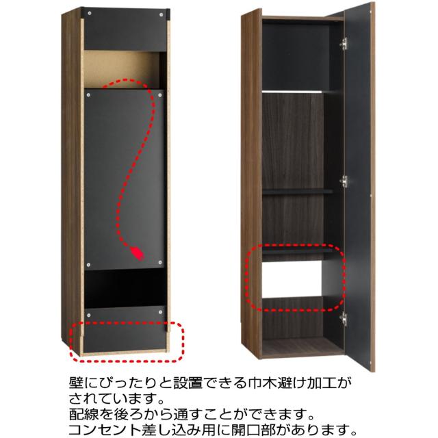 壁にぴったり出来る巾木避け加工や配線を後板の後ろから通せたりコンセント用開口部ありと便利な機能が沢山!