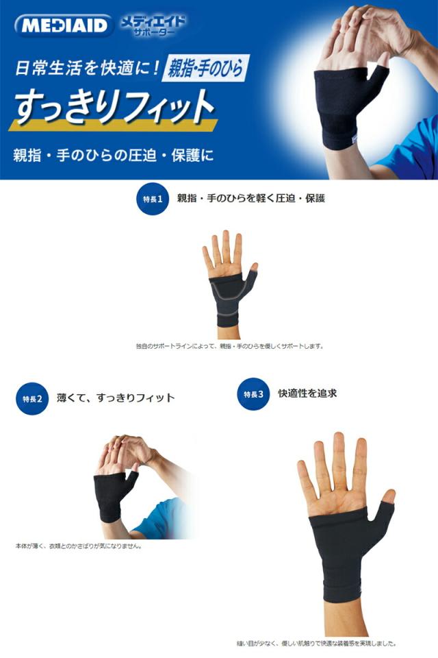 メディエイドサポーター すっきりフィット 親指・手のひら Lサイズ 1個 *日本シグマックス/医療で培った技術/親指.手のひら.軽く圧迫/保護/薄い/すっきりフィット/衣類のかさばり気にならない/縫い目少なく/優しい肌触り/快適/手首の太さ/S:13-15cm/M:15-17cm/L:17-19cm