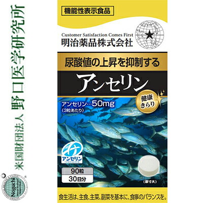 健康きらり アンセリン 90粒 *機能性表示食品 明治薬品/アンセリンは血清尿酸値が健常域で高め(尿酸値5.5〜7.0mg/dL)の方の尿酸値の上昇を抑制することが報告されています