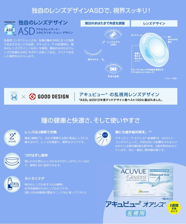 クリアな視界と乾きに強い快適さを目指した アキュビュー オアシス 乱視用 。独自のテクノロジー「ASD(アクセラレイテッド・スタビライゼーション・デザイン)デザイン」と「ハイドラクリアプラス・テクノロジー」*を採用。二重に見えたり、ぼやけたり、乾きやすい環境からすっきり、クリアに見える視界で快適な毎日へ。