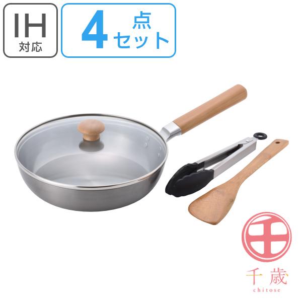 フライパン 24cm IH対応 日本製 4点セット 千歳 ガラス蓋 トング ターナー ( ガス火対応 鉄製フライパン 鉄フライパン 鉄製 オール熱源対応 蓋付き フタ付き 24センチ 炒め鍋 いため鍋 鉄鍋 深型フライパン フライパン ih対応)