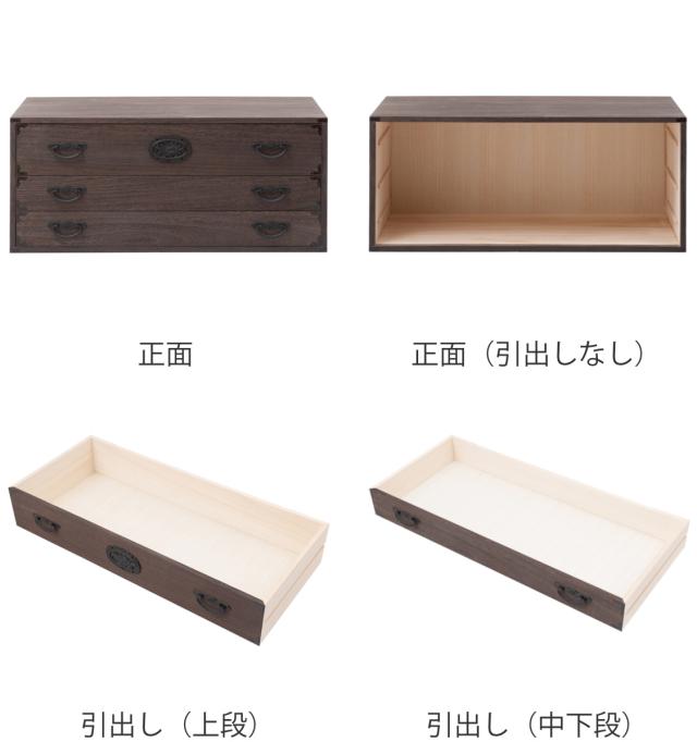 | 材質 | 本体:天然木桐材(焼き仕上げ) 引出し底板・背板:天然木桐化粧板 民芸金具:亜鉛ダイキャスト |