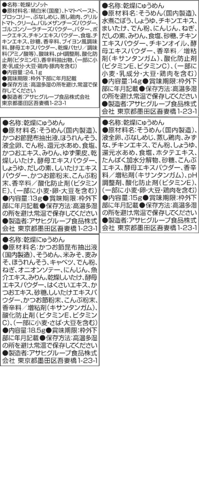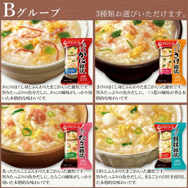 Aグループ ■ 丼の具 とろっと卵の親子丼の具 22.5g 甘とろ卵の牛とじ丼の具 23.8g 七種具材の中華丼の具 17g ■ シチュー 彩り野菜のクリームシチュー 21.6g 5種具材のビーフシチュー 25.5g ■ カレー 野菜と鶏肉のカレー 36.4g ひきわり豆のトマトカレー 36g Bグループ ■ 雑炊 ほぐし身入り かに雑炊 20.5g ほぐし身入り さけ雑炊 20.7g 炙り たらこ雑炊 21g まるごと 貝柱雑炊 19.8g ■ リゾット 濃厚3種のチーズリゾット 24g 完熟トマトのチーズリゾット 24.1g ■ にゅうめん とろみ醤油 14g すまし柚子 13g まろやか鶏だし 15g 五種の野菜 あっさりみそ味 18.5g 2食単位で好きなものを選べる12食セット Aグループ7種から3種6食 Bグループ10種から3種6食 お選びください |