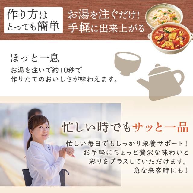 海鮮 雑炊 チーズ リゾット にゅうめん ご飯 にかける 丼の具 シチュー 野菜 カレー から 組み合わせ 自由 お湯 を 注ぐだけ で 簡単 出来立て の 美味しさ を