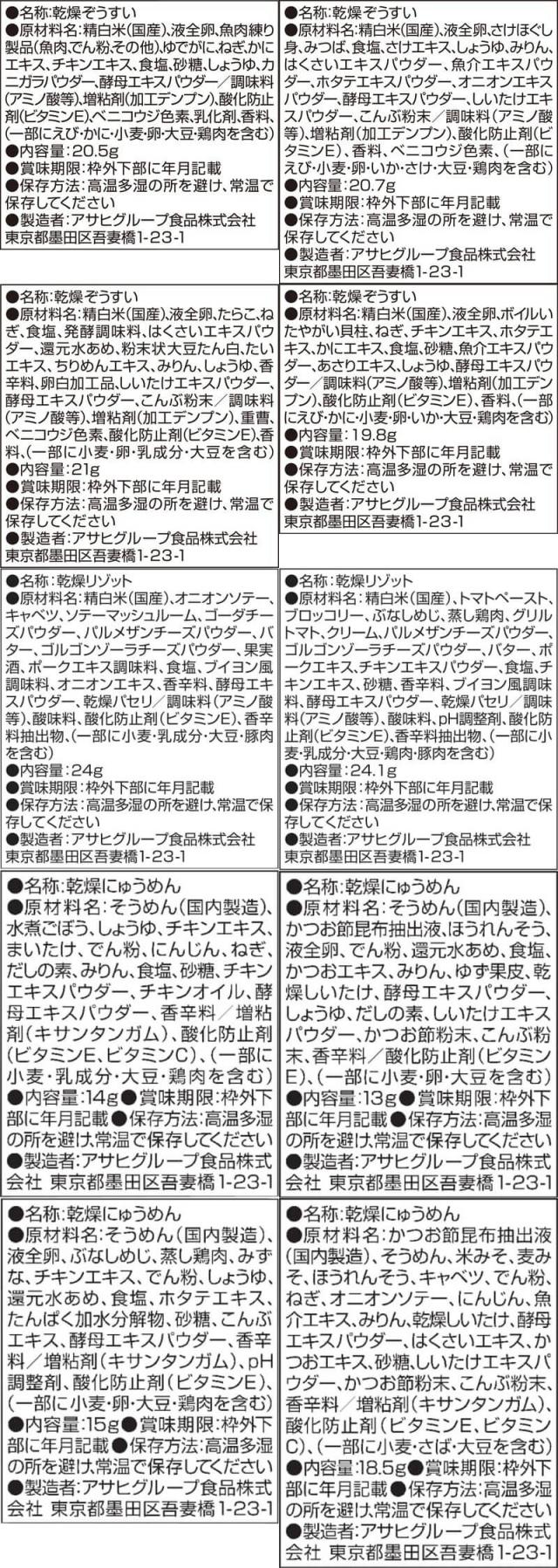 ■ 雑炊 ほぐし身入り かに雑炊 20.5g ほぐし身入り さけ雑炊 20.7g 炙り たらこ雑炊 21g まるごと 貝柱雑炊 19.8g ■ リゾット 濃厚3種のチーズリゾット 24g 完熟トマトのチーズリゾット 24.1g ■ にゅうめん とろみ醤油 14g すまし柚子 13g まろやか鶏だし 15g 五種の野菜 あっさりみそ味 18.5g 10種の中から2食単位で 好きなものを選べる6種12食セット |