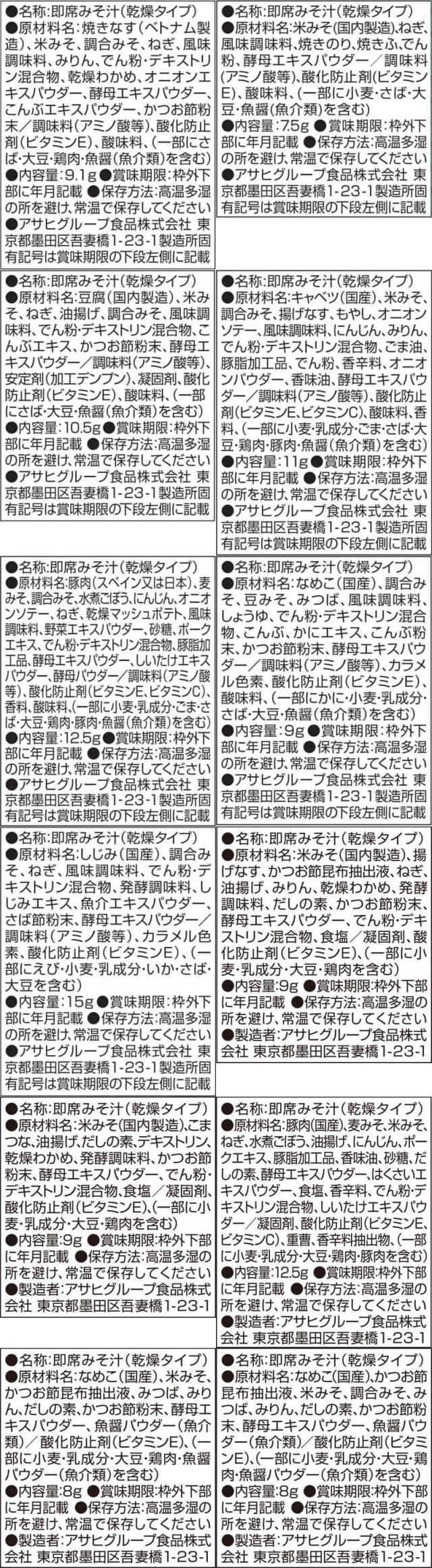 ■ いつものおみそ汁 贅沢 焼なす 9.1g 海苔 7.5g とうふ 10.5g 炒め野菜 11g 豚汁 12.5g なめこ 9g しじみ 赤だし 15g ■ 旨だし おみそ汁 なす汁 合わせ 9g こまつ菜 合わせ 9g 豚汁 12.5g なめこ 合わせ 8g なめこ 赤だし 8g ■ Theうまみ ごはんがうまい! 特製たまごスープ 7.0g スパイスカレースープ 8.7g 旨辛チゲスープ 8.9g 15種の中から5食単位で 好きなものを選べる6種30食セット |