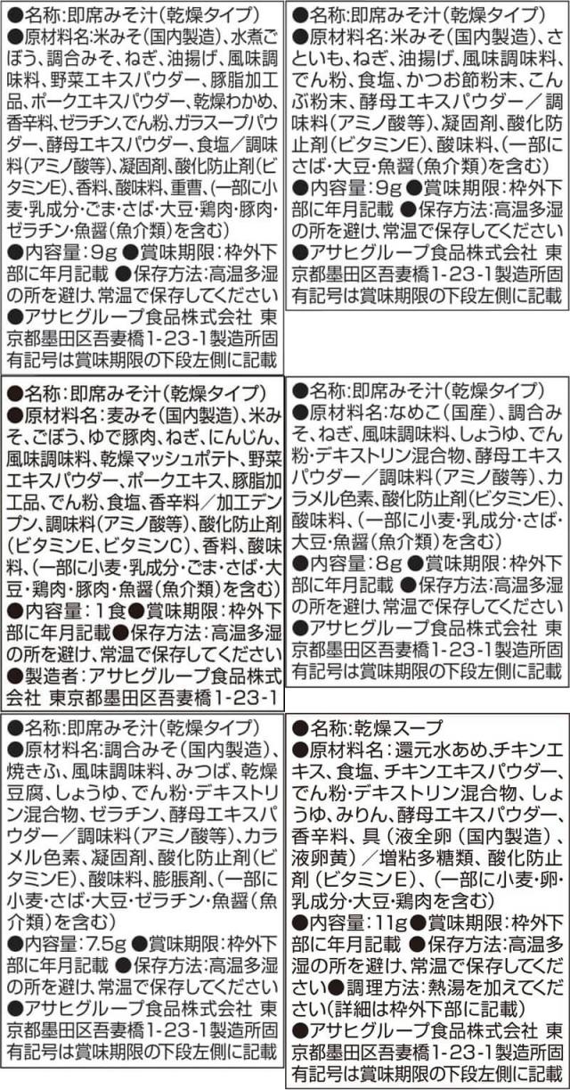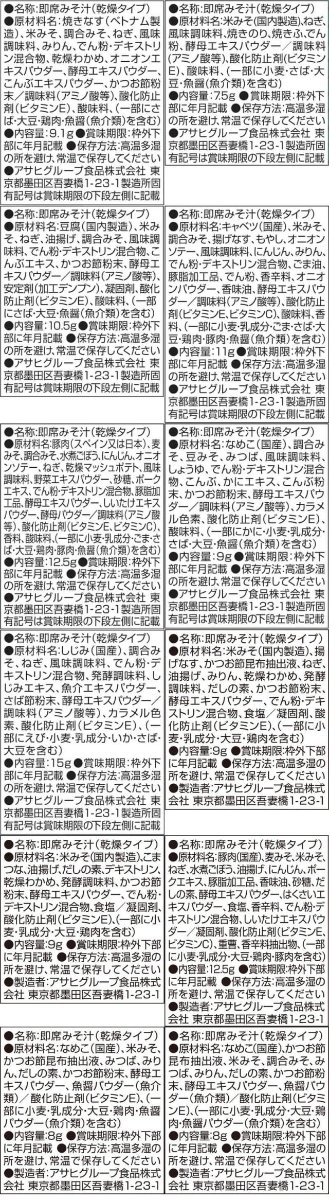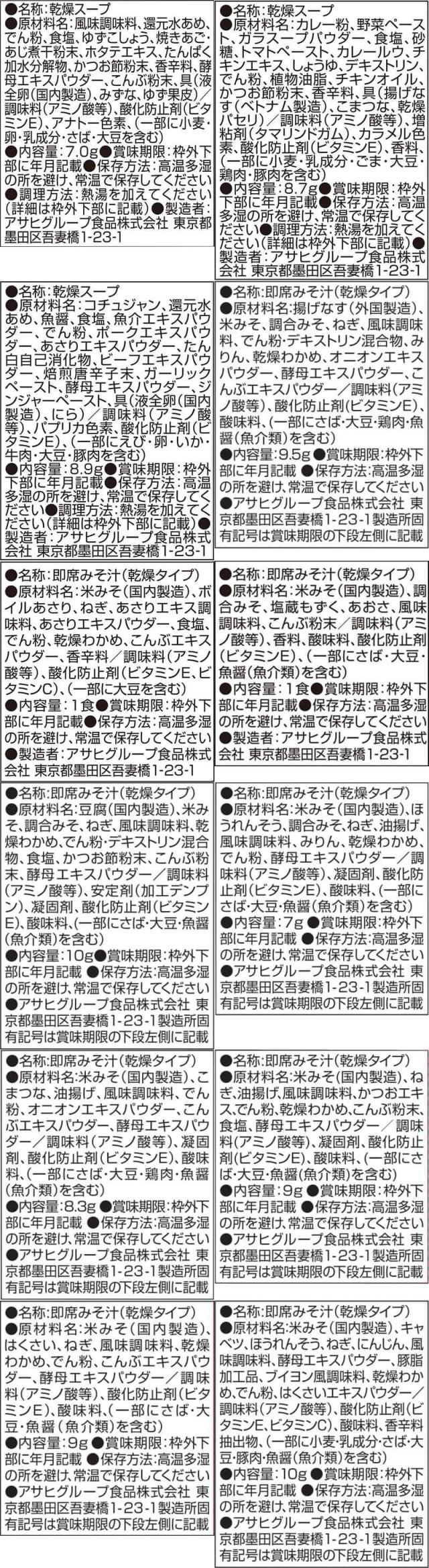 Aグループ ■ いつものおみそ汁 贅沢 焼なす 9.1g 海苔 7.5g とうふ 10.5g 炒め野菜 11g 豚汁 12.5g なめこ 9g しじみ 赤だし 15g ■ 旨だし おみそ汁 なす汁 合わせ 9g こまつ菜 合わせ 9g 豚汁 12.5g なめこ 合わせ 8g なめこ 赤だし 8g ■ Theうまみ ごはんがうまい! 特製たまごスープ 7.0g スパイスカレースープ 8.7g 旨辛チゲスープ 8.9g Bグループ ■ いつものおみそ汁 なす 9.5g あさり 7.4g あおさ 8.2g とうふ 10g ほうれん草 7g 小松菜 8.3g 長ねぎ 9g 白菜 9g 野菜 10g ごぼう 9g 里いも 9g とん汁 10.5g なめこ 赤だし 8g 赤だし 三つ葉入り 7.5g ■ Theうまみ たまごスープ 11g 5食単位で好きなものを選べる30食セット Aグループ15種から2種10食 Bグループ15種から4種20食 お選びください |
