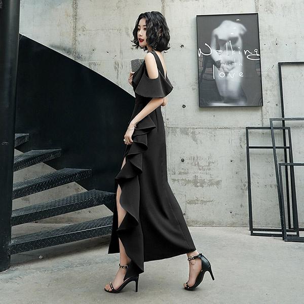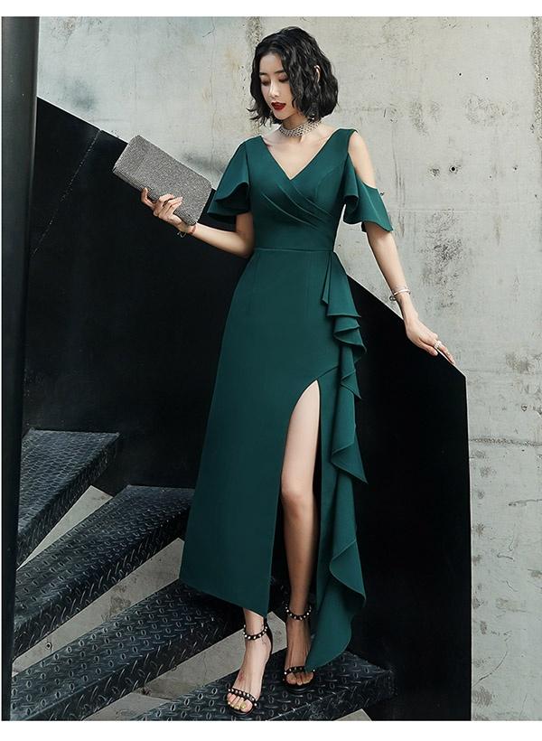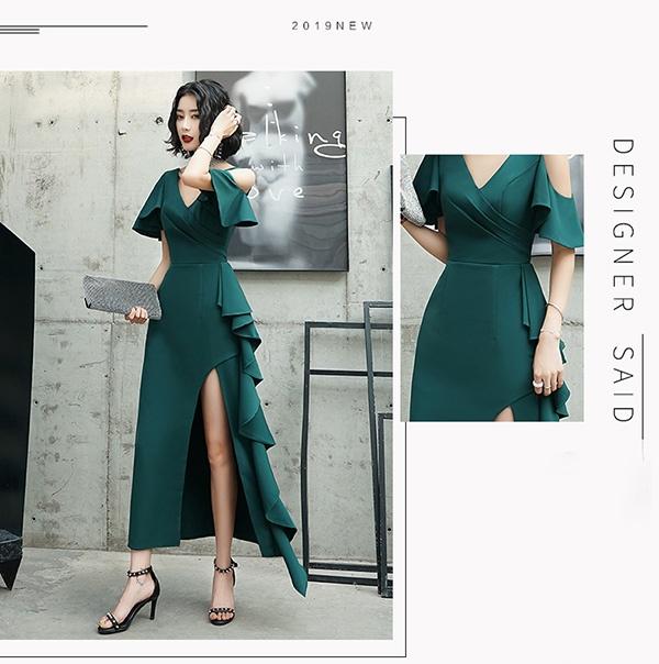 サイドスリット ロングドレス vネック 肩出し フリル 二次会 背中開き カクテルドレス 緑 グリーン ワンピース 胸元セクシー イブニングドレス 大きいサイズ パーティー用 発表会 披露宴 演奏会 XS S M L XL 2XL 3XL da034x1