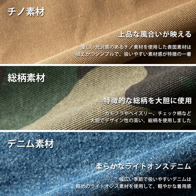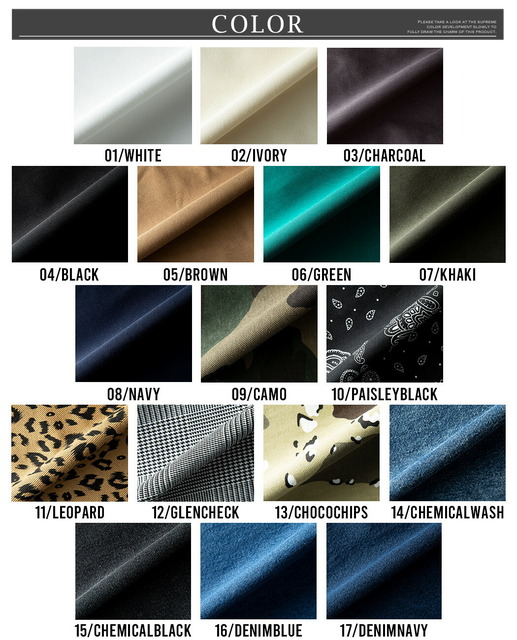 | ホワイト アイボリー チャコール ブラック ブラウン グリーン カーキ ネイビー カモ ペイズリーブラック レオパード グレンチェック チョコチップス ケミカルウォッシュ ケミカルブラック デニムブルー デニムネイビー |