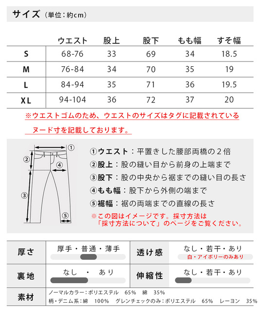 | サイズ | ウエスト | 股上 | 股下 | もも幅 | 裾幅 |