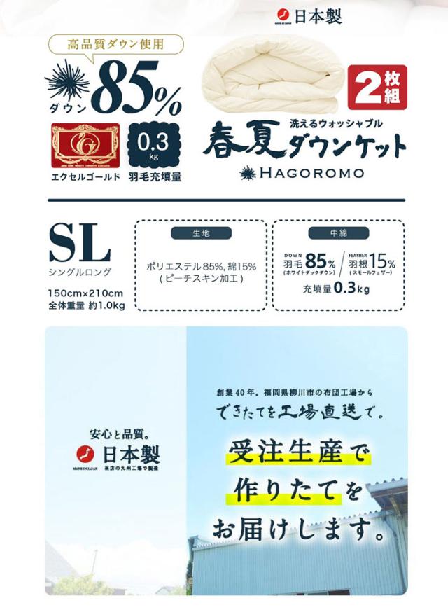 ダウンケット 2枚セット 洗える 日本製 85% 0.3kg 羽毛肌掛けふとん シングル ウォッシャブル シングルロング ふとん ふわふわ(代引不可)
