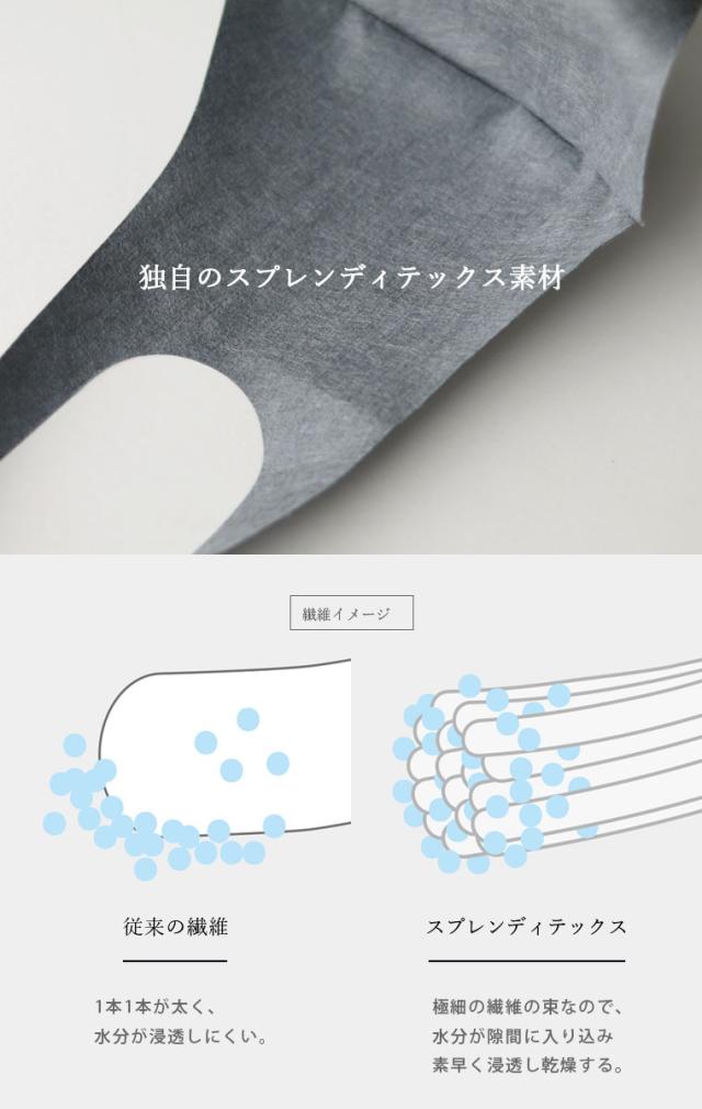 「スプレンディテックス」は、優れた吸水性と速乾性があり薄くて軽くて丈夫な超高密度のマイクロファイバー素材。すぐにカラッと乾くので、洗濯や部屋干しの嫌なニオイも残りにくく素肌に優しい感触です。