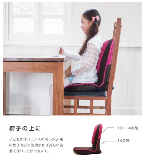 椅子の上でも使用できます。無理せず良い姿勢が保てるので、こどものやる気アップにもつながります。