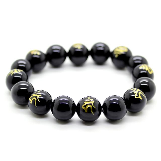 石輝 酉生まれ カーン 金彫り守護梵字 オニキス14mm ブレスレット 数珠 メンズ 天然石 [b531_7]