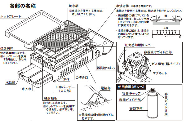 | 材質 | 本体:鋼板 焼き網:スチール 上部フレーム、バーナーヘッド:ステンレス |