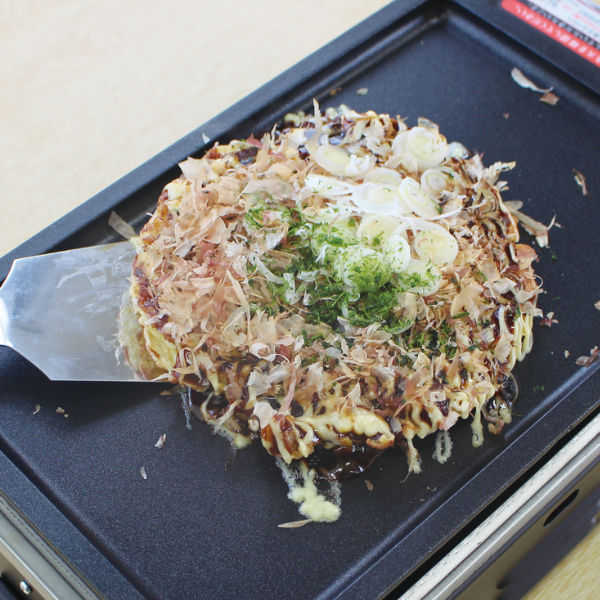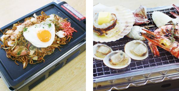 | 網焼き 網をセットして、肉や野菜などの焼き物を楽しめます。キャンプでのバーベキューや釣りなどのレジャーでの海鮮焼にもおすすめです。 | プレート焼き 付属のプレートを設置して、ホットプレートとして使用できます。焼きそばやお好み焼きなどの調理に最適です。ガス式なので、電源やコードを気にする必要がなく、場所を選びません。 |