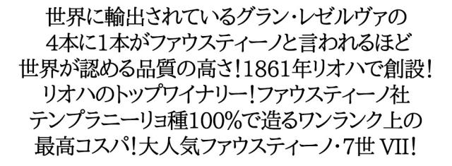 世界に輸出されているグラン・レゼルヴァの 4本に1本がファウスティーノと言われるほど世界が認める品質の高さ!1861年リオハで創設!リオハのトップワイナリー!ファウスティーノ社テンプラニーリョ種100%で造るワンランク上の最高コスパ!大人気ファウスティーノ・7世 VII!