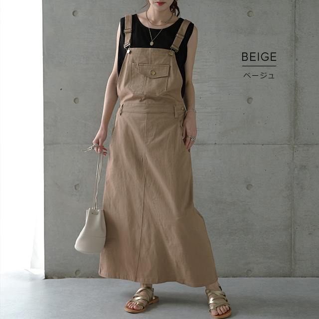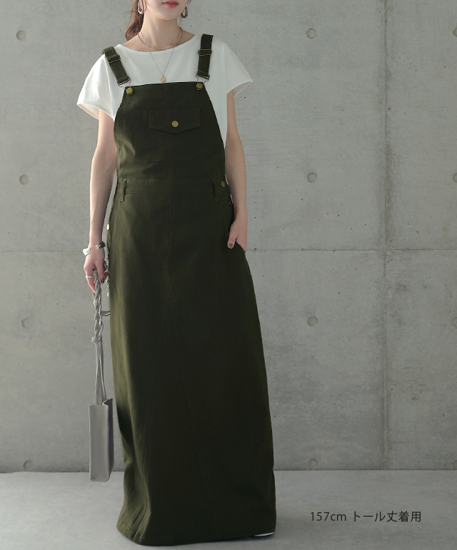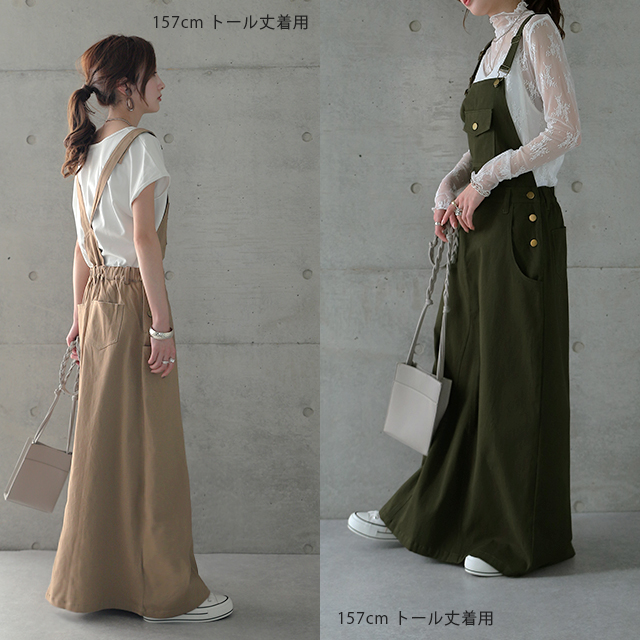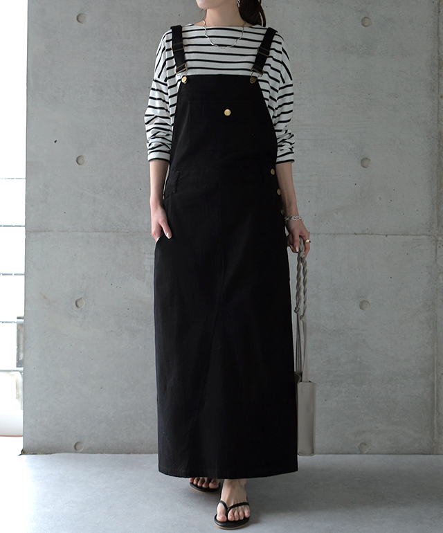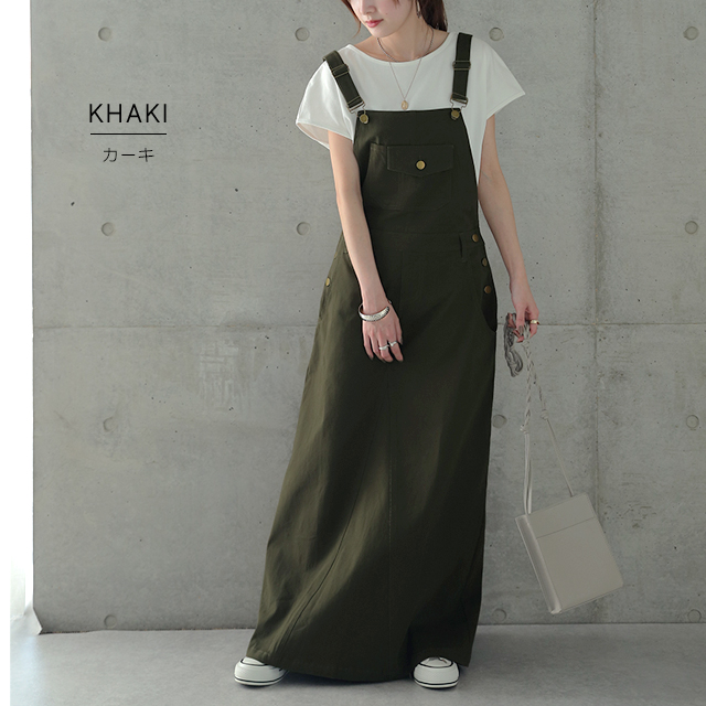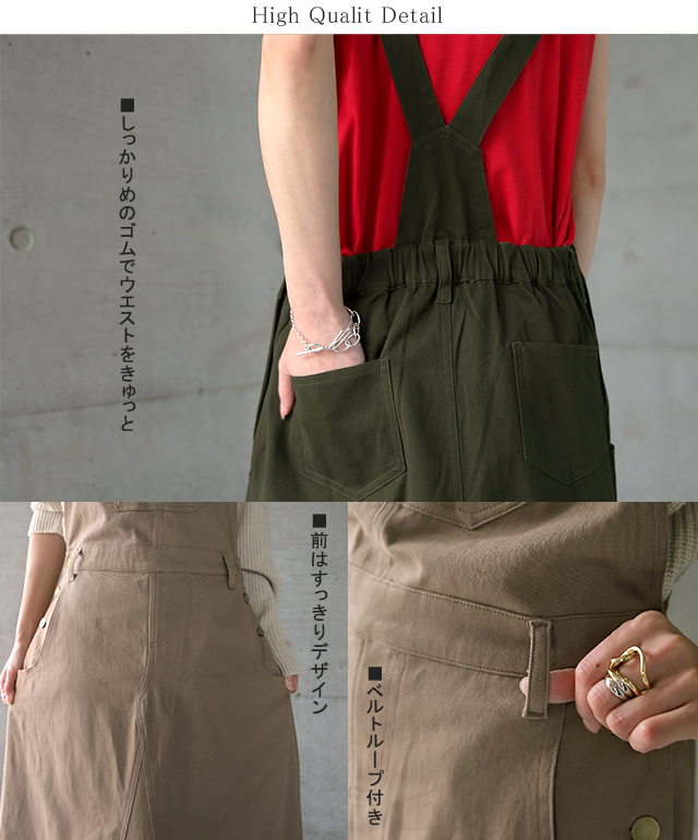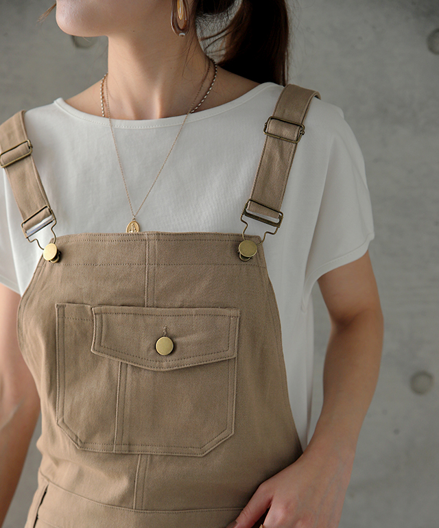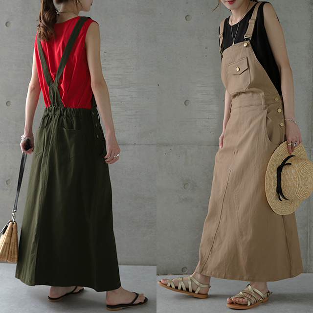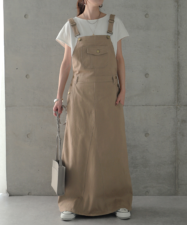 動きやすさも追求したワークテイストのサロペットスカート。