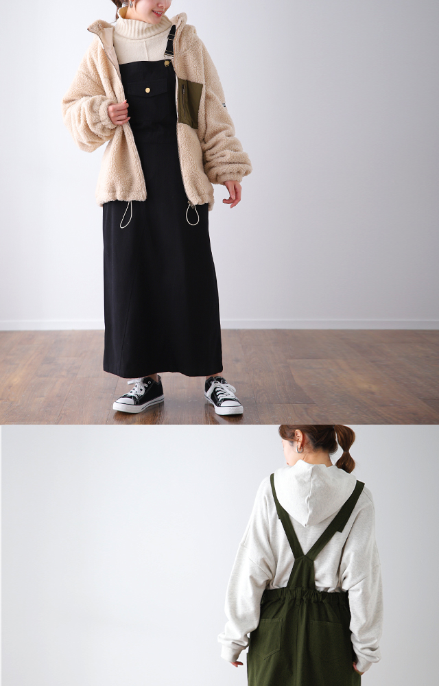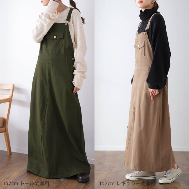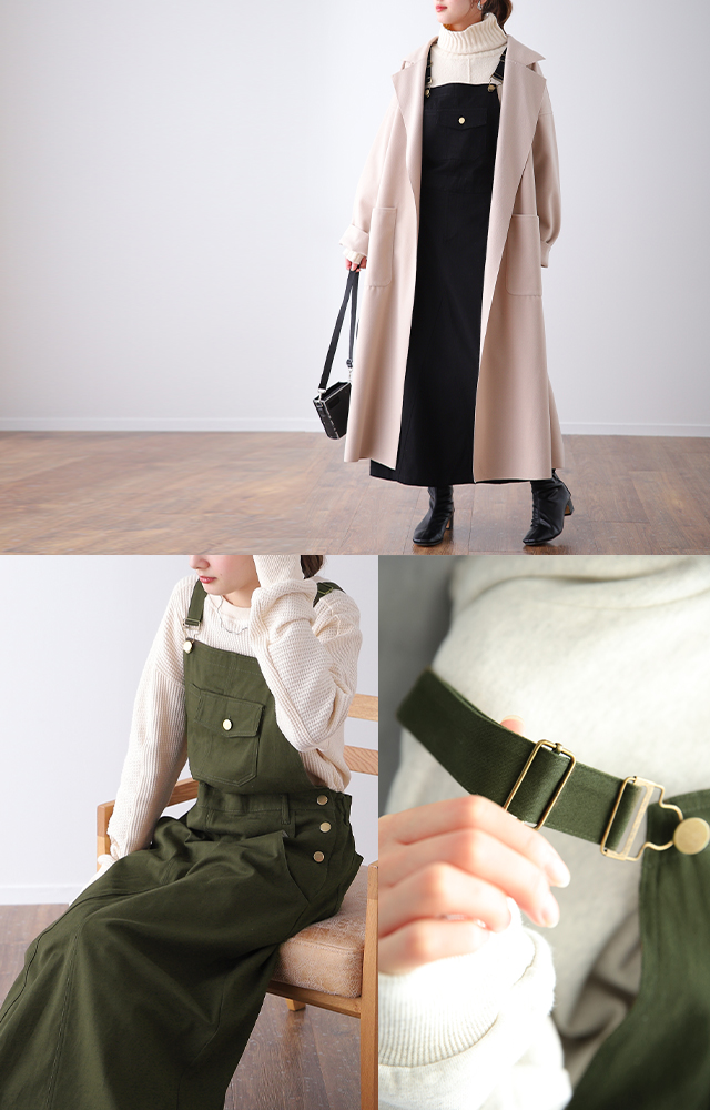 身長に合わせて丈が選べ、更には肩紐でサイズ感の調整もできるのでどんな方もOK。