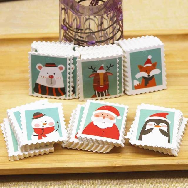 サンタクロースや白熊やペンギンやトナカイや狐をデザインしたまるで切手のような波フレームのクリスマスに最適のペーパータグ。