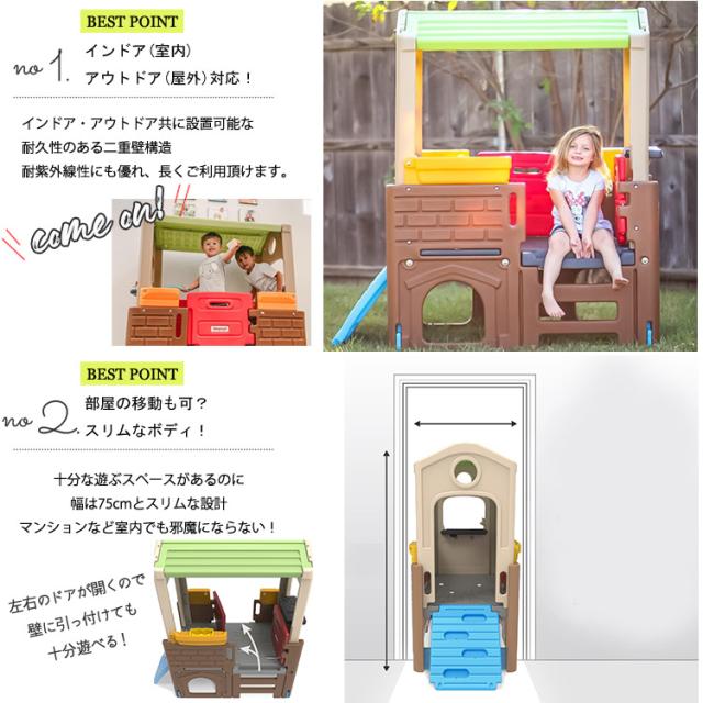 2階建て風の子供達の笑顔が溢れるプレイハウス。 クライミングやハシゴで登ったら、 キッチンもあり、ままごとにはバッチリ! お絵かきボードや、下階は秘密基地? 丸や四角の穴を通り抜けて遊べる! ・インドア、アウトドア共に設置可能 ・耐久性のある二重壁構造 ・耐紫外線性加工が施されています ・75cmのスリムボディでマンションにもお勧め ・風通しの良いオープンウィンドー ・全ての角は丸く安全面も配慮 |