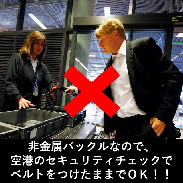 機能(2):ビジネス用のベルトと違い、バックルが金属ではないので空港の面倒なセキュリティチェックもつけたままでOK! また非金属なので金属アレルギーの方にも安心して使って頂けます