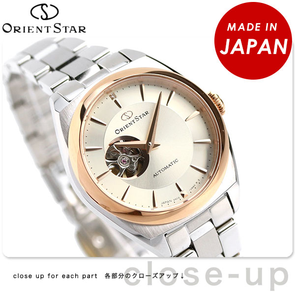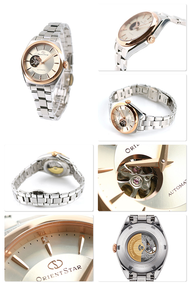 入荷時期未定予約受付中 正規品 7年保証キャンペーン 送料無料 オリエントスター コンテンポラリー セミスケルトン オープンハート 日本製 自動巻き ペアウォッチ レディース 腕時計 RK-ND0101S ORIENT STAR CONTEMPORARY SEMI SKELETON アナログ ゴールド ◆「優しく夜空を照らす三日月と美しく輝く星」をテーマにデザインされたモデルが登場。丸くカットする9時位置のセミスケルトン部分に敢えて変形したカットを施し、優しい光を放つ三日月を表現しました。12時位置のダイヤモンドは夜空に輝く星をイメージしています。丸みを帯びた柔らかなベゼル形状と程良くエッジを聞かせたラグ形状が特徴。オープンハートが特徴的な機械式デザインでありながら、小柄なケースサイズを実現しました。文字板カラーには女性らしい柔らかなシャンパンゴールドを採用。アクセサリー感覚で身に着けることができ、様々なシーンでさりげなくおしゃれな腕元を演出します。 発売日:20年11月発売 機械式腕時計 Made in Japan