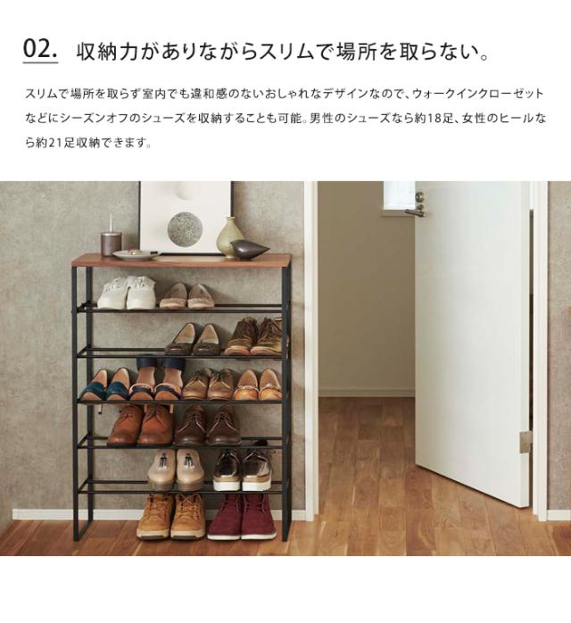 温かみと高級感のある木目調天板には、鍵などの小物を置いたり、インテリア小物などを飾って空間を演出。サイドには、付属のフックが付いているので、靴べらや、折り畳み傘などの小物もまとめて収納できます。スリムで場所を取らず室内でも違和感のないおしゃれなデザインなので、ウォークインクローゼットなどにシーズンオフのシューズを収納することも可能。男性のシューズなら約18足、女性のヒールなら約21足収納できます。
