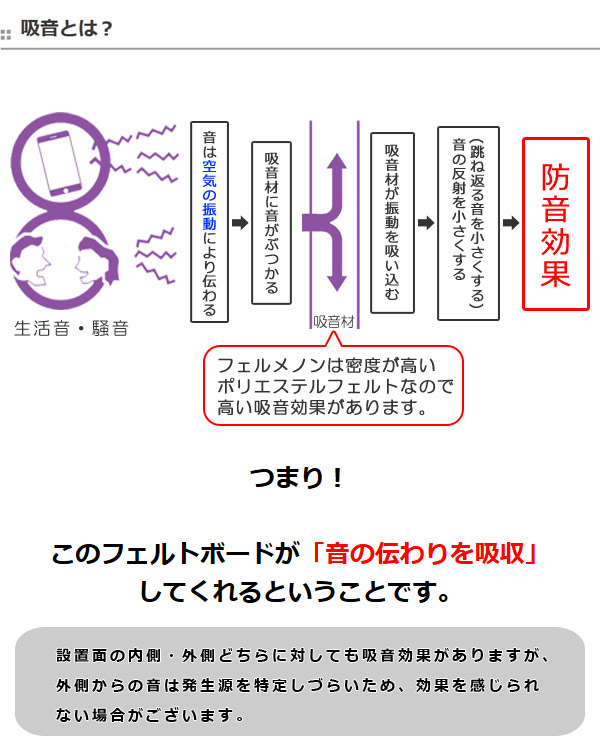 お手軽に防音できる!フェルト吸音マット「どうしても気になってしまう騒音。でも騒音工事費は高い・・・」 そんなお悩みを、この吸音フェルトボードが解決します! 防音工事に比べ「ローコスト」、面倒な工事も不要で、「お手軽」に取り付けできます。バリエーションも豊富なので、「インテリア」として空間を演出しながら、お部屋の騒音をおさえてくれる吸音フェルトボードの「フェルメノン」です。 ![]() ![]() テレビやステレオの音を楽しめる 「ご近所と生活リズムが違う。迷惑になっていないかな」「迫力ある映画や音楽を音を気にせず観たいけど、隣の迷惑になっていないか気になる」 →専門的な施工は不要。後付けができ、取り付けは簡単です。さらに吸音効果により音をクリアにし、よりよいサウンドで楽しめます。 ![]() 楽器や演奏の音漏れ防止に 「ピアノやギターなどの楽器の演奏は、ご近所への音漏れが気になって、なかなか出来ない!」 →通常の防音工事は高額です。フェルトボードならローコストで誰でも簡単に取り付け可能です。 ![]()