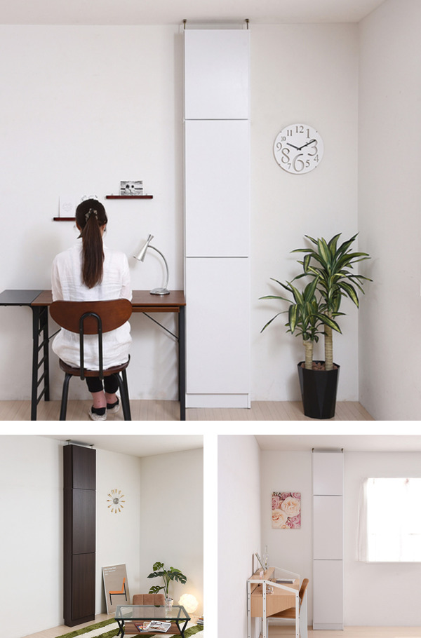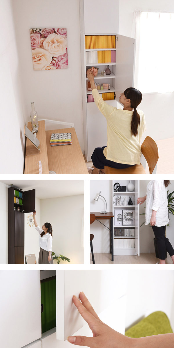 扉を閉めていても圧迫感の少ないスッキリとしたデザインです。来客時にはさっと片付けて扉の中にしまっておくことができます。お部屋の雰囲気に合わせてお選びいただける3色展開で、エンボス加工を施したダークブラウンはシックで落ち着いた印象です。木目のないシンプルなホワイトは、お部屋をより明るく演出します。