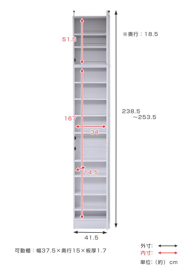 | サイズ | 約 幅41.5×奥行18.5×高さ180.5(cm) 上置き:約 幅41.5×奥行18.5×高さ58〜73(cm) |