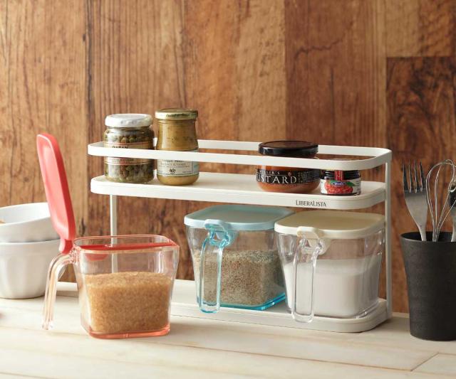 4色展開なので、同じ色でまとめたり、調味料に合わせて色を変えたり、お好みで組み合わせることができます。また、別売りのラックと合わせて使えば、スッキリ収まり、ゴチャつきがちな調味料もスッキリ整います。