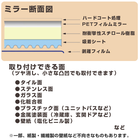 重さはガラスミラーの半分以下で、数種類の材料を貼りあわせた複合素材なので、落ちても割れません。粘着剤を使わない特殊吸着シートなので剥がす時に壁を傷めません。