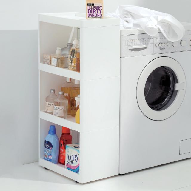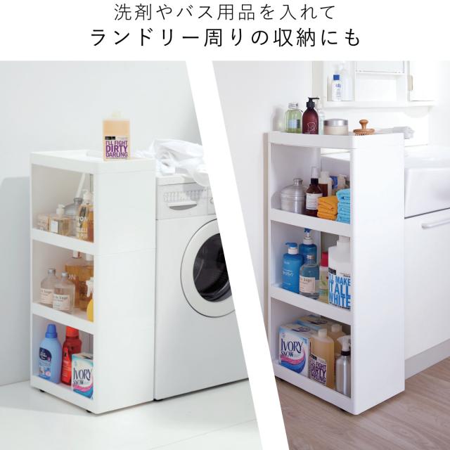サイドオープンワゴンはキッチンだけでなく、ランドリー周りの収納としてもおすすめです。洗濯機や洗面所横の隙間に置けば洗剤類やバス用品が片付きます。