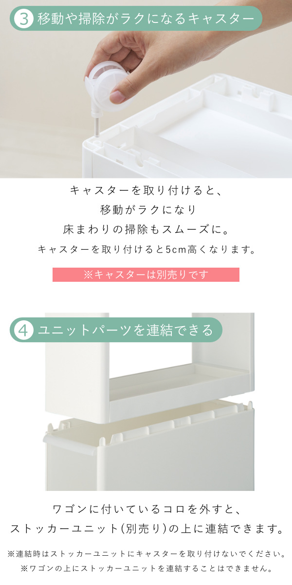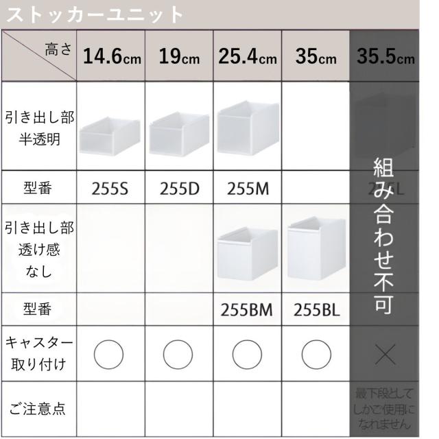 | 注意事項 | ※一度組み立ててしまうと取り外すことができません。 【ストッカーユニット(引出パーツ)と組み合わせてご使用になる場合】 ※高さが1m45cmを越える場合は必ず壁面や家具に沿わせ、転倒に十分注意してください。 ※移動の際は前方を少し持ち上げてください。 |
