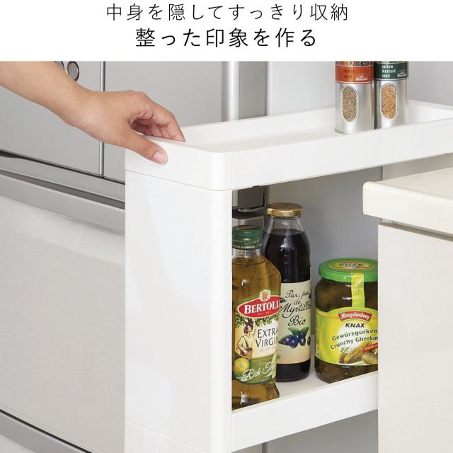 キッチンの少しの隙間にちょうどいいサイドオープンワゴンです。幅25.5cmとスリムですが、たっぷり収納できます。ストック食品や調味料、ペットボトル飲料など置き場に困るものをまとめれば、キッチンがすっきりした空間になります。