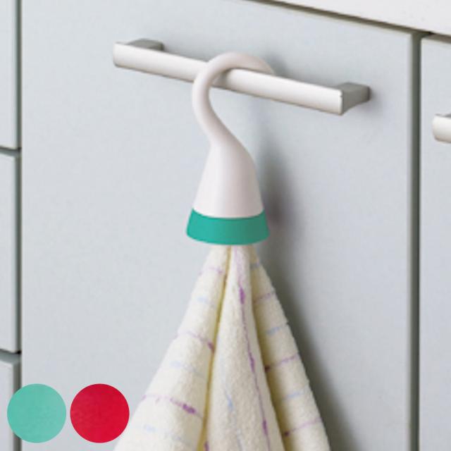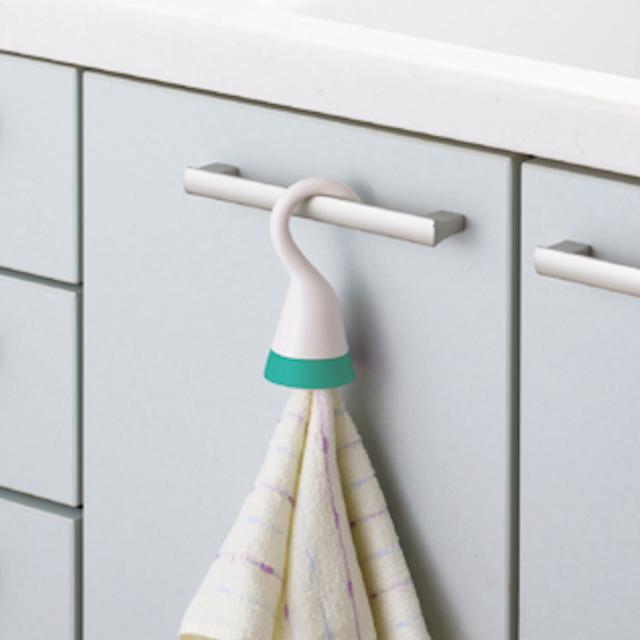 使いたい時に、使いたい場所で使用できる、どこにでも掛けられる押し込み式のタオルフックです。シンク下の戸にかけたり、ドアの取手にかけるなど好きな場所で使えて便利です。