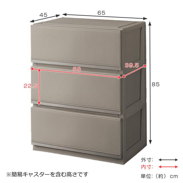 | サイズ | 約 幅65×奥行45×高さ85(cm) 引出し一段あたりの内寸:約 幅58×奥行39.5×高さ22.5(cm) |