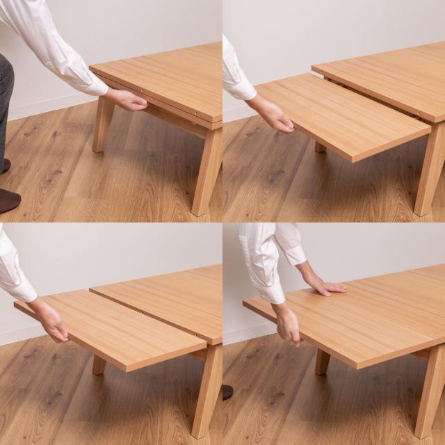 シーンに合わせて天板のサイズを3段階に変更できるテーブルです。生活スタイルに合わせて幅を変えられるので、家族や友人との食事の際など柔軟に対応してくれます。